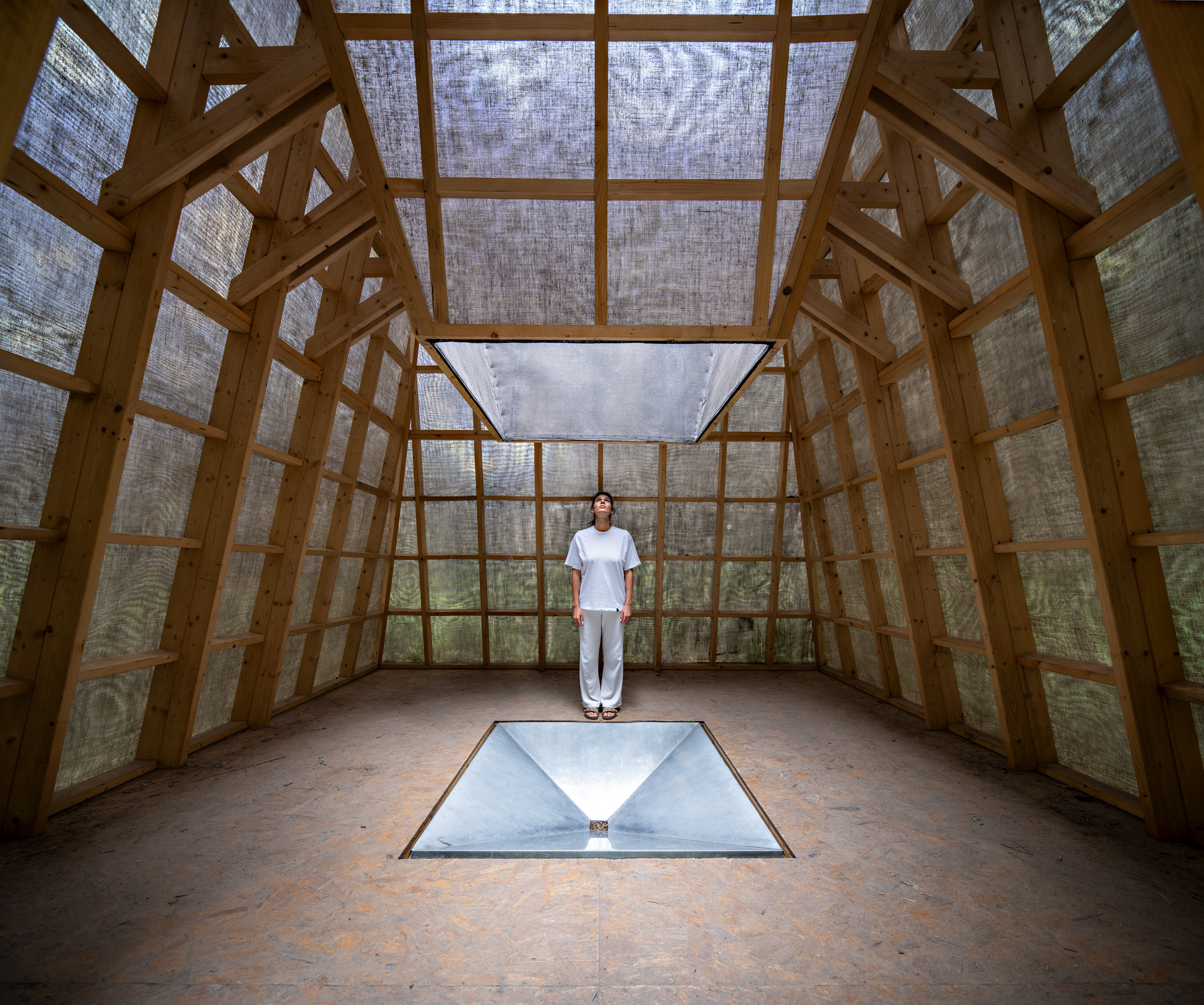 Su pabellón más reciente, Cumpluvium, es un artefacto resonante con el agua, poniendo en valor la lluvia persistente de la región de Rouen (Francia) y del entorno boscoso de Canteleu, logrando que el cerramiento traslúcido de fibra de vidrio con resina y lino de Normandía conecte con la atmósfera sombría del bosque.